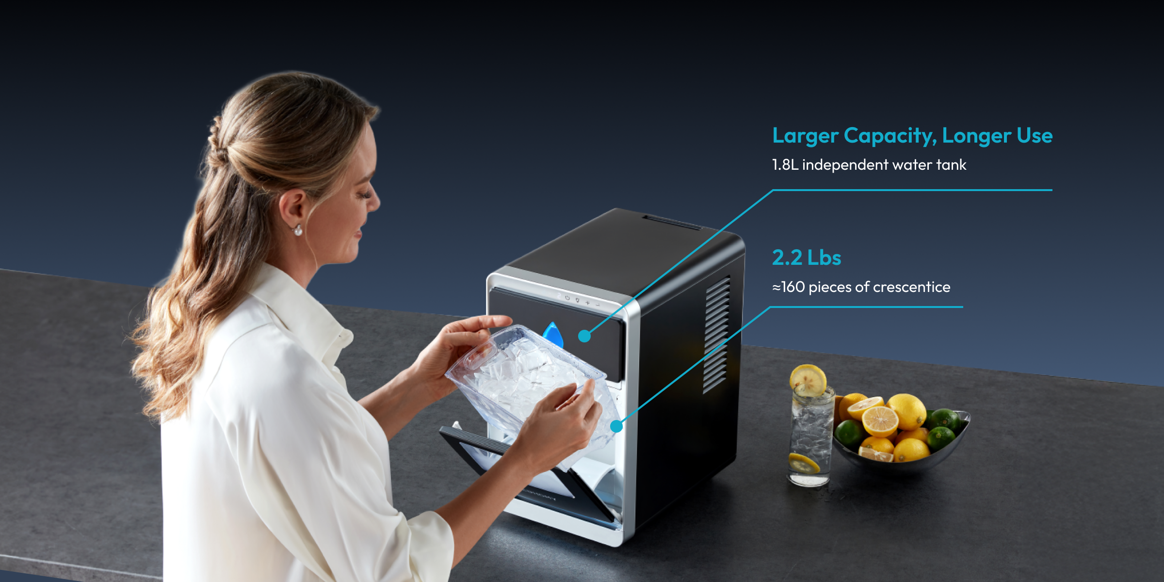 Produces 16 crescent ice cubes in just 10–15 minutes, with a daily output of up to 28 lbs (12 kg). Powered by a high-efficiency, eco-friendly refrigerant, it delivers rapid ice making while maintaining excellent energy efficiency.