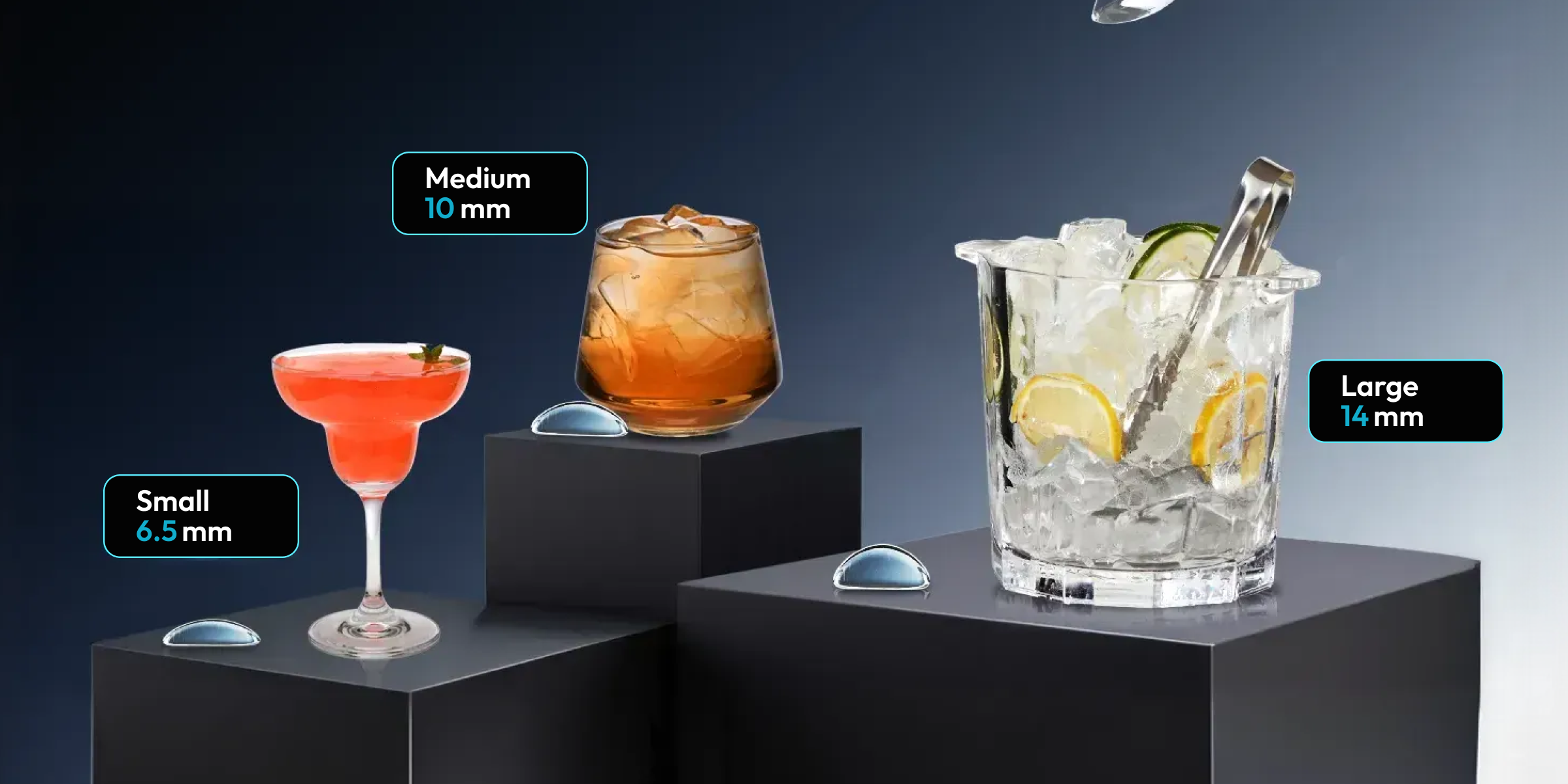 - Extra-Thick Ice (up to 14 mm) — Slow-melting ice ideal for long sipping sessions, keeping drinks chilled and flavorful longer.